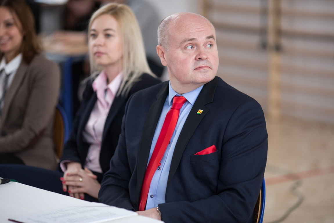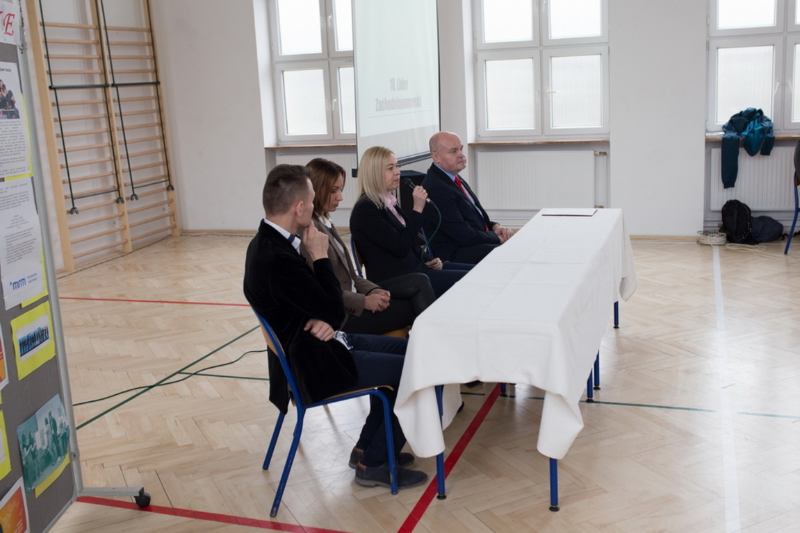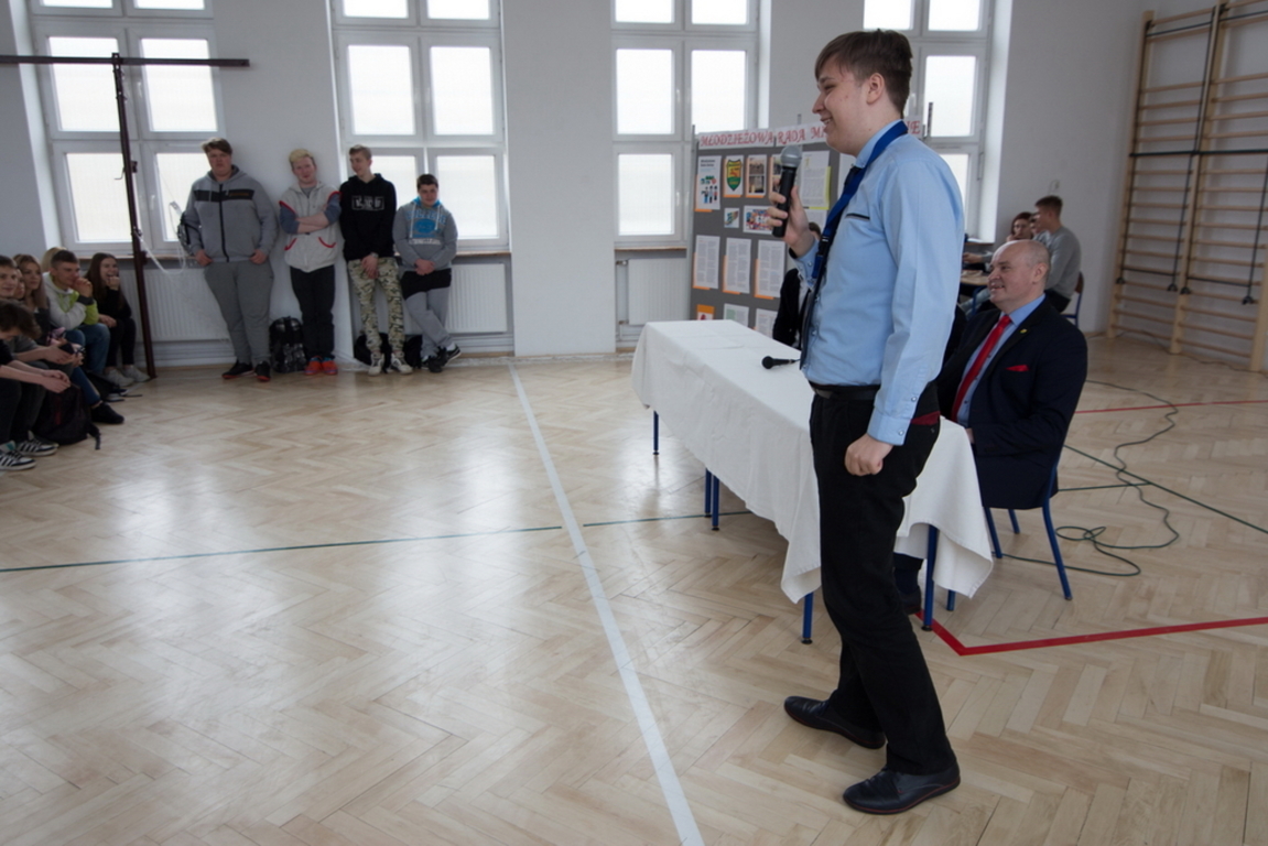Uczestnicy spotkania (głównie z klas pierwszych i drugich) mogli się dowiedzieć o licznych działaniach podjętych przez MRM w I kadencji. Mogli również obejrzeć (a nawet dotknąć!) insygnia przewodniczącego rady młodzieżowej. W trakcie swej wizyty burmistrz – Piotr Ćwikła wręczył list gratulacyjny najbardziej aktywnemu członkowi Młodzieżowej Rady Miejskiej – Michałowi Stefanowskiemu. W ten sposób włodarz naszego miasta potwierdził, że zaangażowanie Michała w działania lokalnych struktur samorządowych, jak i wojewódzkich (praca w liderze zachodniopomorskim nad przygotowaniem Europejskiego Tygodnia Młodzieży – Szczecin 11-18.05.2017r.) jest dostrzegana i bardzo wysoko ceniona. Pan burmistrz podziękował za zaangażowanie w wybory i współpracę z Młodzieżową Radą Miejską również pani Barbarze Król i Pani Barbarze Smolskiej – Nazarek.