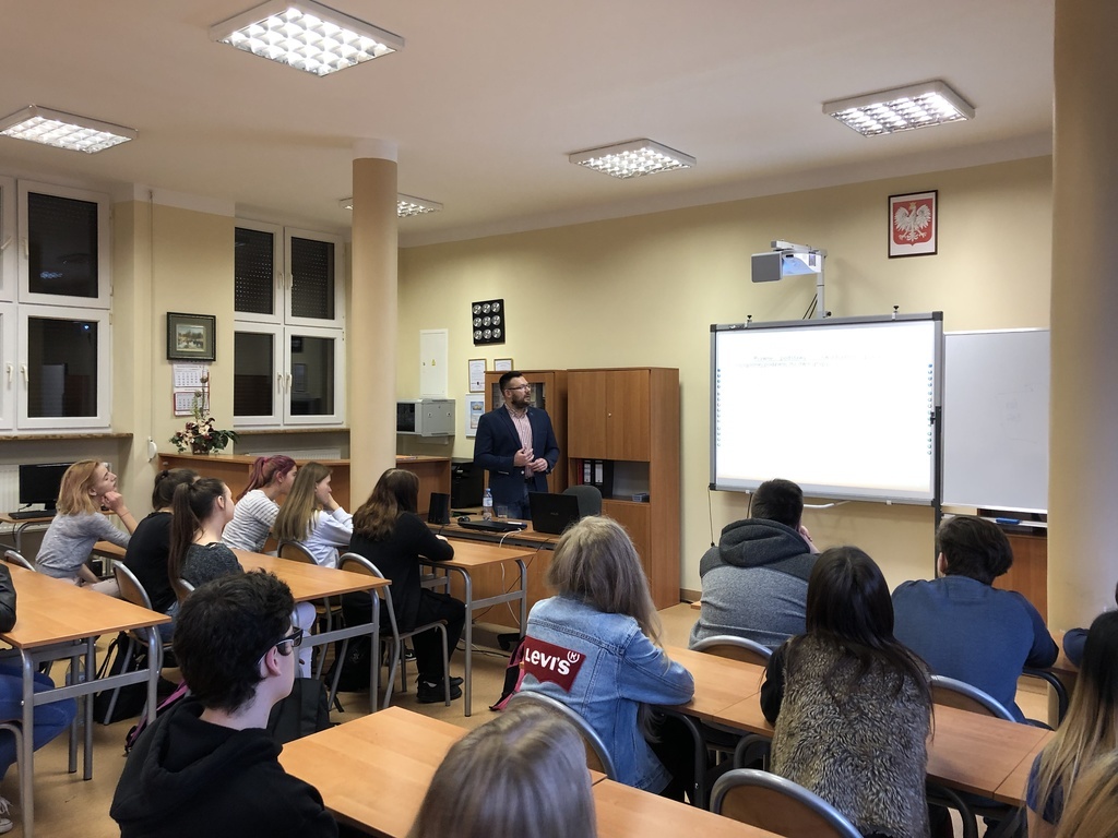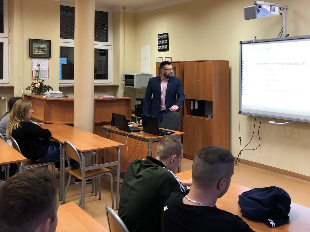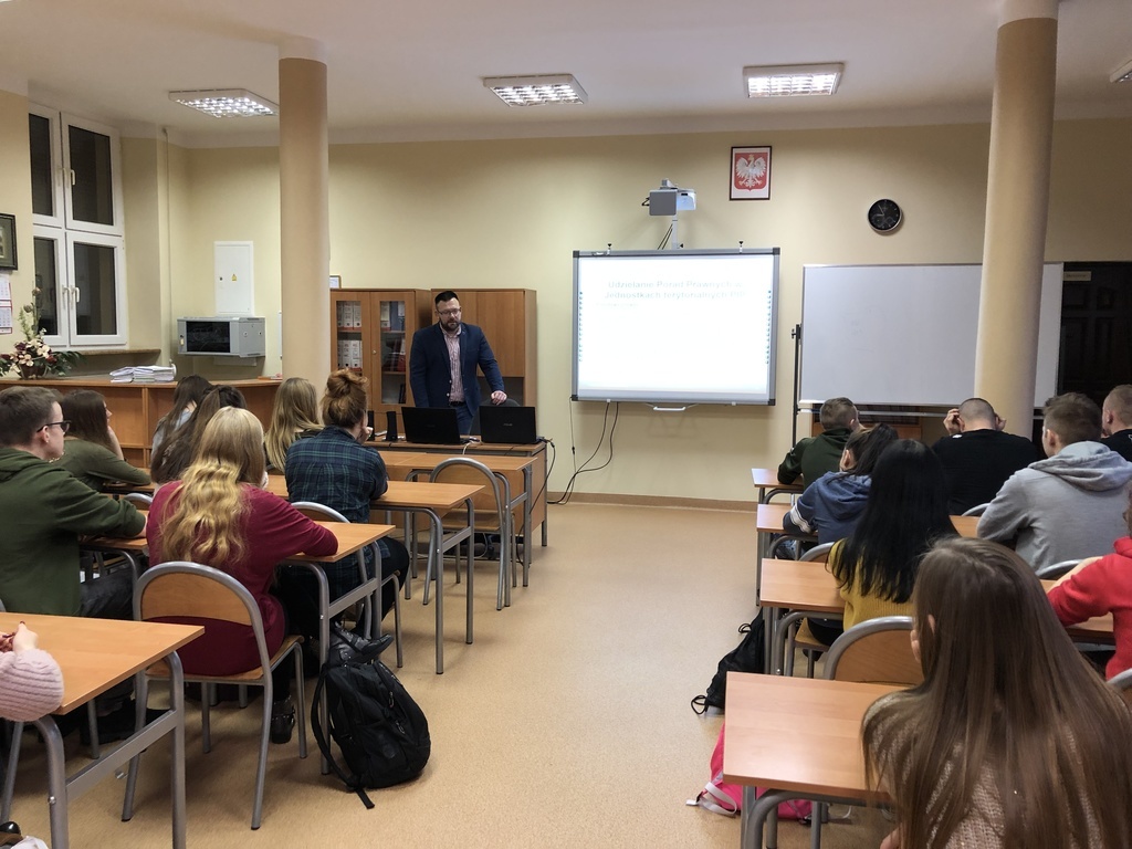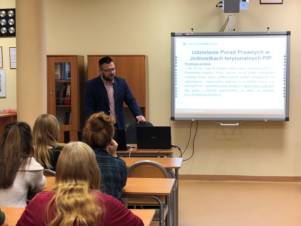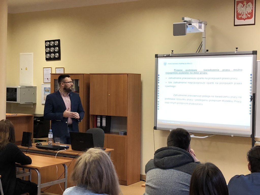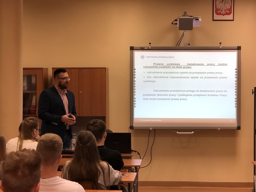 Inspektor PIP wyjaśnił młodzieży zagadnienia związane z prawnymi aspektami zawierania pierwszych umów o pracę, rozwiązywania tych umów, wynagrodzenia za pracę oraz odrębności w prawie pracy dotyczące pracowników młodocianych. Pan Marcin Prokop szczegółowo omówił poszczególne form zatrudnienia na podstawie umów cywilnoprawnych, a następnie wskazał cechy odróżniające je od umowy o pracę.
