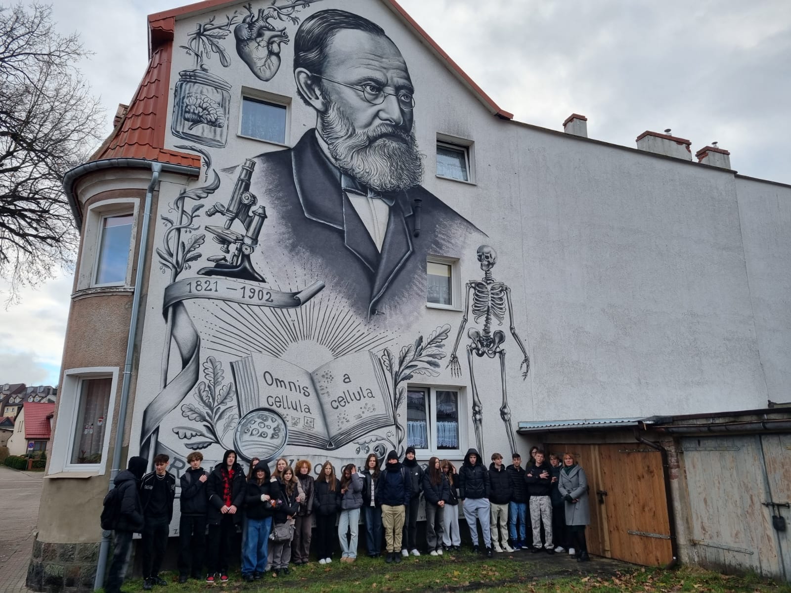 To miejsce szczególnie nas zachwyciło, zwłaszcza możliwość skorzystania z okularów 3D. Dzięki nim przenieśliśmy się do świata wirtualnej rzeczywistości, co było niezwykle realistycznym i emocjonującym doświadczeniem. Oprócz tego mieliśmy okazję przeprowadzić eksperymenty na interaktywnych stanowiskach, które pozwalały na poznanie ciekawych zjawisk fizycznych i chemicznych. Na zakończenie dnia udaliśmy się na spacer po mieście, podczas którego obejrzeliśmy mural przedstawiający Rudolfa Virchowa. Jego niezwykła forma i artystyczny przekaz wzbudziły w nas podziw i refleksję. Rudolf Ludwig Karl Virchow był odkrywcą znaczenia komórek w organizmie i twórcą współczesnej patologii.