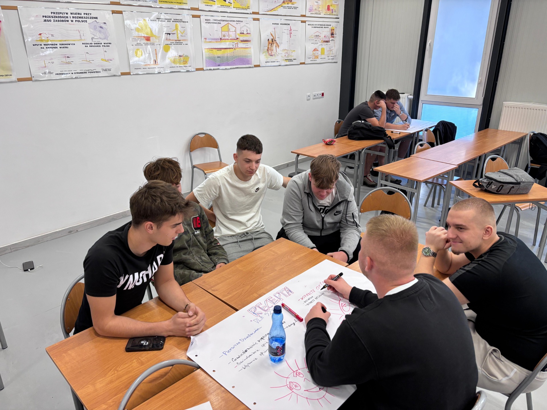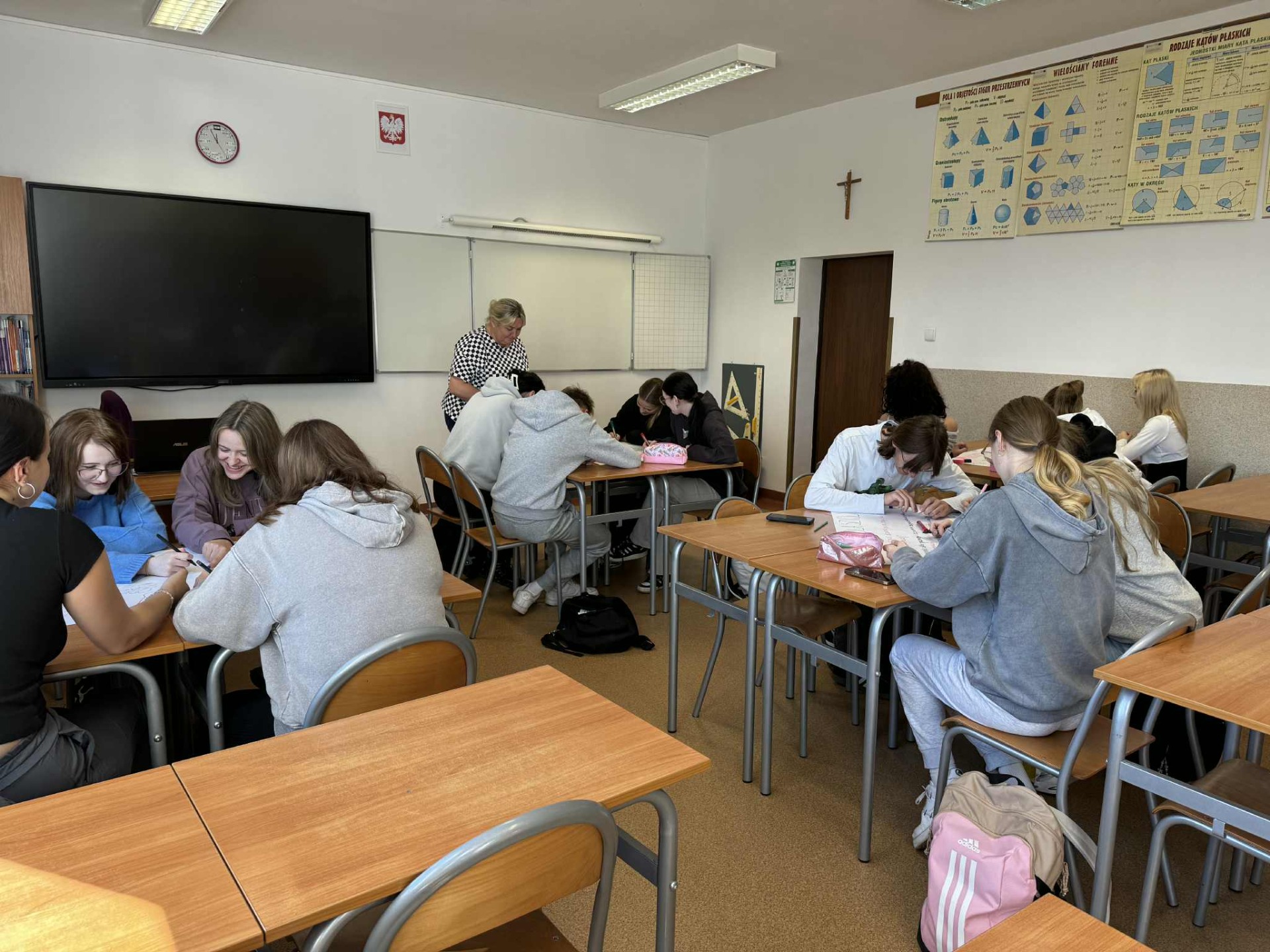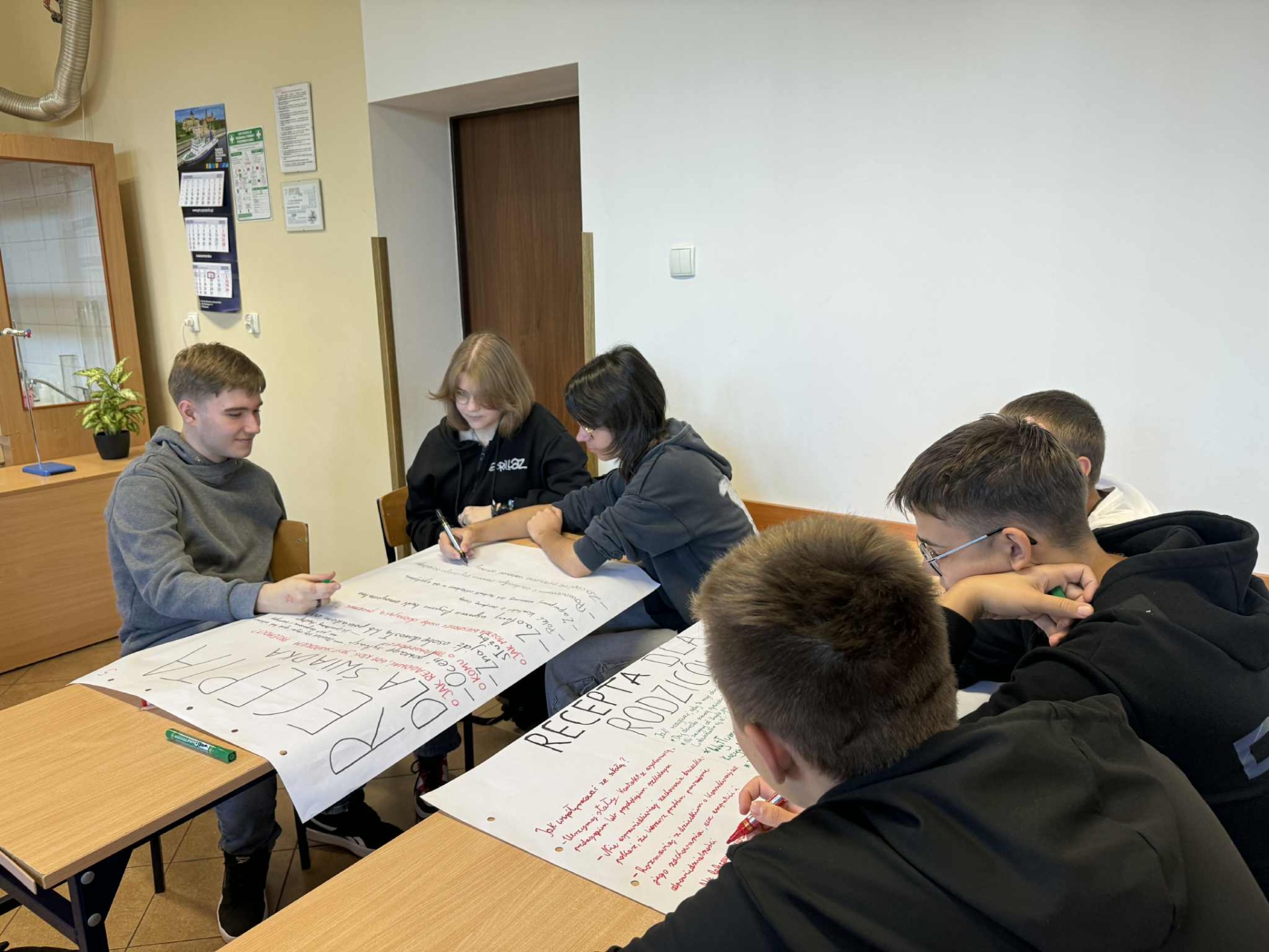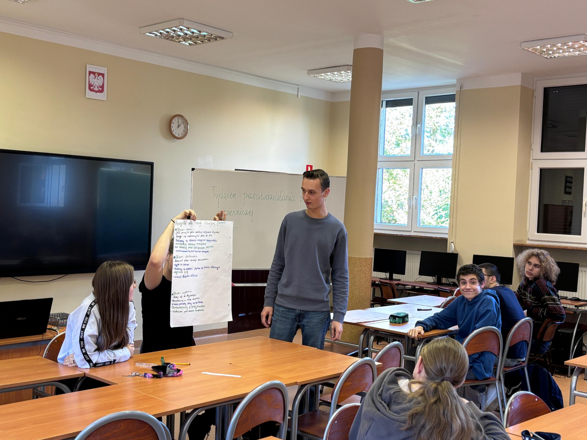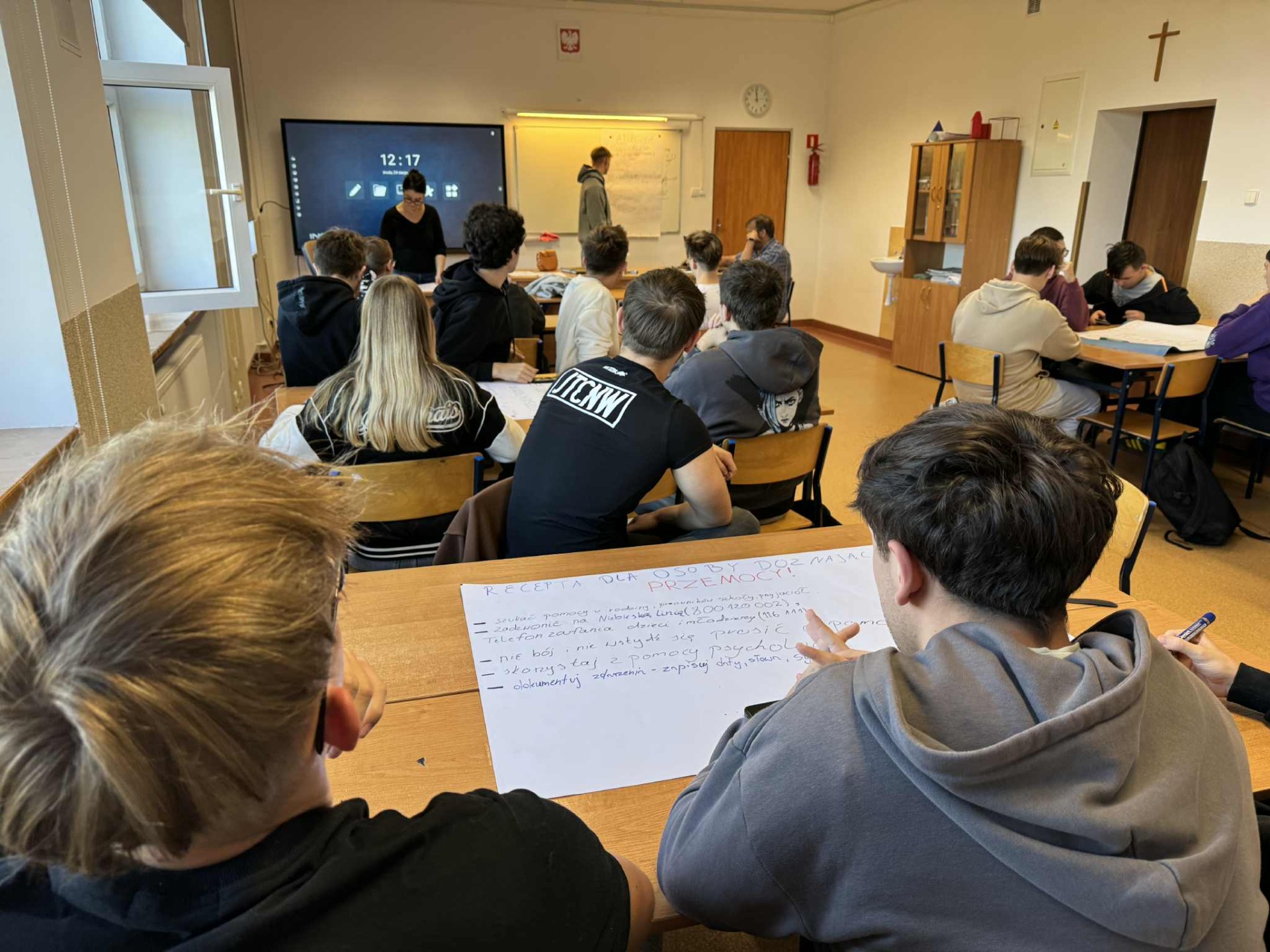 W naszej szkole również włączyliśmy się w działania tego tygodnia. Odbyły się lekcje wychowawcze poświęcone przemocy i cyberprzemocy, podczas których uczniowie dyskutowali, jak budować atmosferę bezpieczeństwa w klasie i reagować w trudnych sytuacjach. W każdej klasie zorganizowaliśmy warsztaty „Szkolna Apteczka Wsparcia”, na których uczniowie tworzyli recepty pierwszej pomocy w sytuacji przemocy rówieśniczej i wspólnie opracowali klasową apteczkę wsparcia. Następnie pomysły młodzieży zostały przeniesione do programu Canva w formie plakatów i broszur w ramach szkolnej kampanii „Razem przeciw przemocy”.