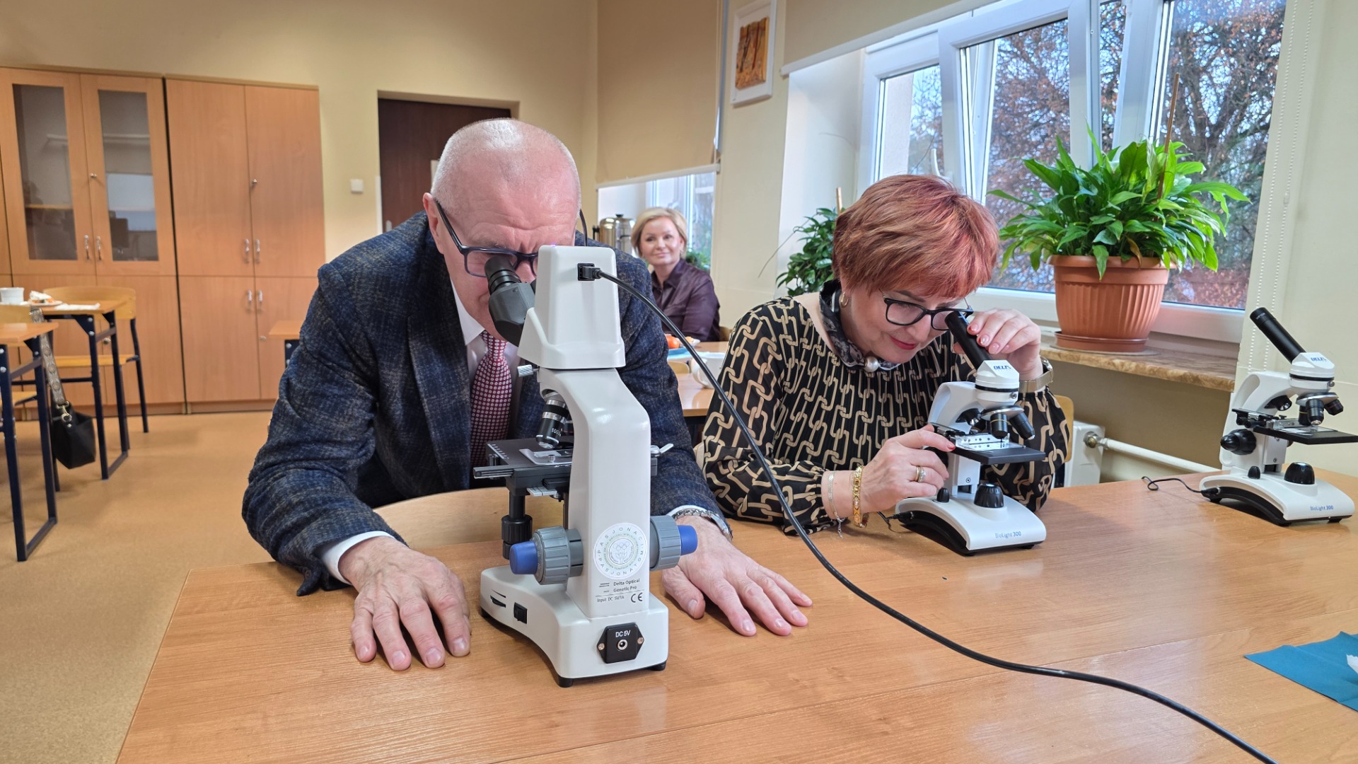 Kolejnym punktem spotkania była prezentacja pozyskanych w ramach projektu pomocy dydaktycznych do przedmiotu biologia, wirtualnego atlasu anatomicznego oraz mikroskopu z kamerą cyfrową, która umożliwia wyświetlanie obrazu na ekranie monitora. Prezentację poprowadziła pani Karolina Pawluś wraz z uczennicami. Goście zobaczyli również, w jaki sposób na lekcjach wykorzystywane są zakupione narzędzia edukacyjno-profilaktyczne.